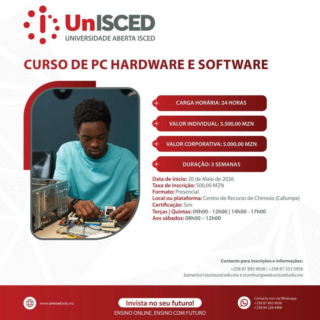 Com este propósito, a UnISCED apresenta o curso integrado de PC Hardware & Software e Microsoft Office & Google Apps), concebido para capacitar jovens, estudantes, profissionais e entusiastas da tecnologia com competências práticas e actuais. Este programa oferece uma abordagem completa, que vai desde os fundamentos do funcionamento do computador até ao uso eficiente de ferramentas digitais no dia-a-dia, preparando os participantes para os desafios do mercado actual.