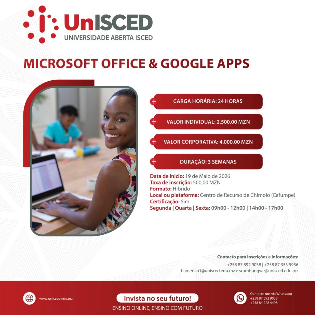 Investimento: 3.500,00 MZN (individual) | 5.000,00 MZN (corporativo) - Microsoft Office & Google Apps (24 horas)